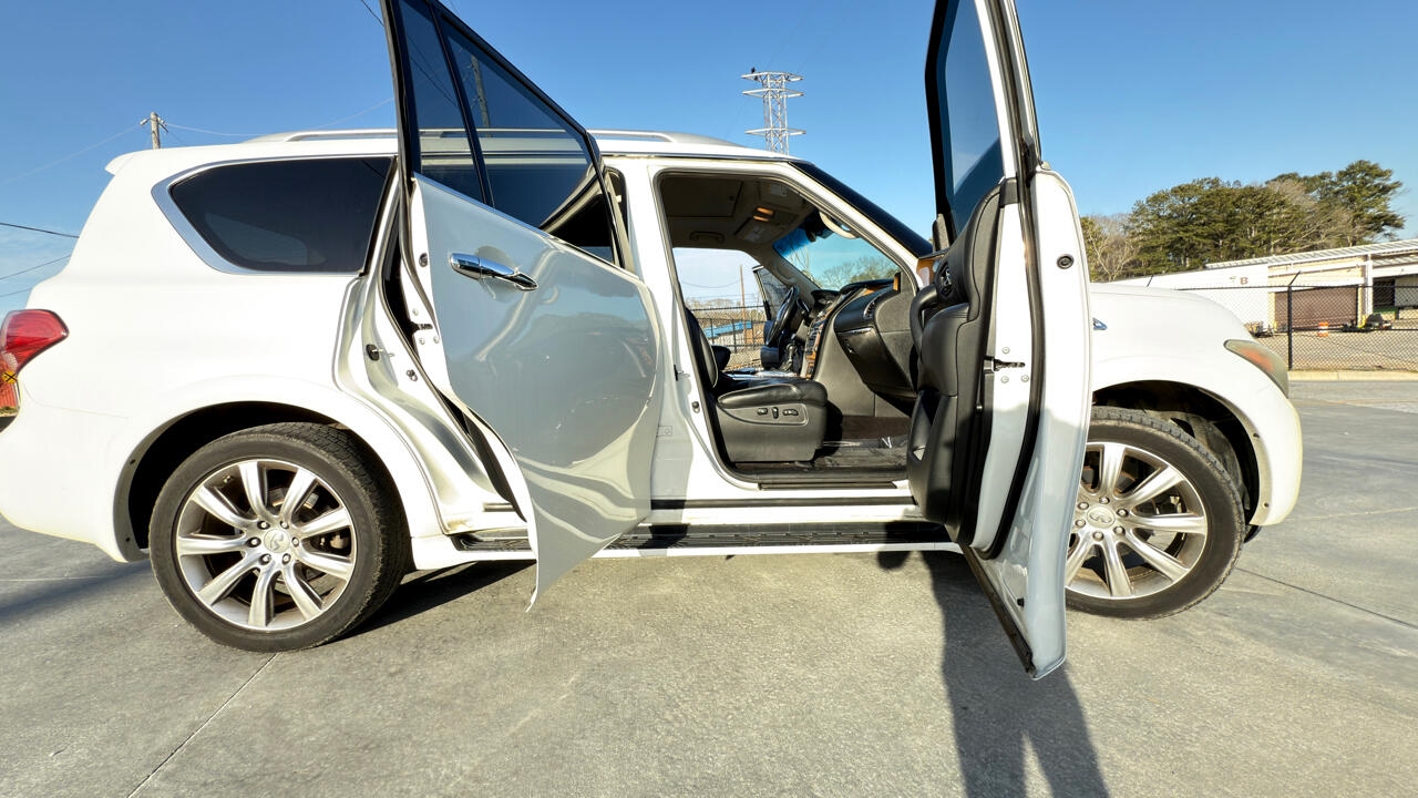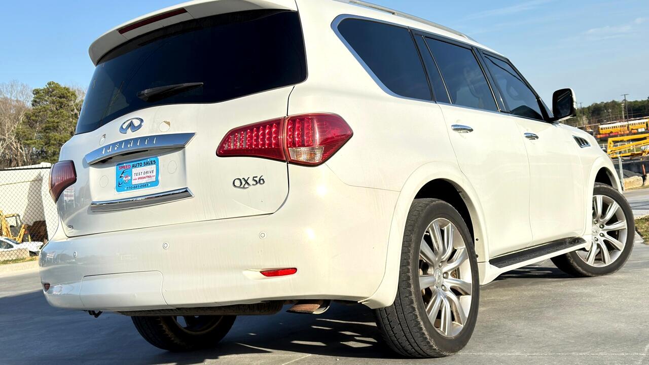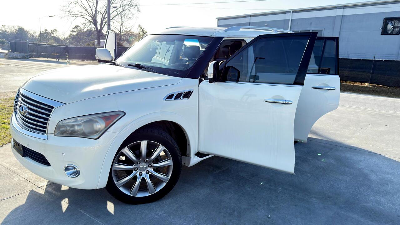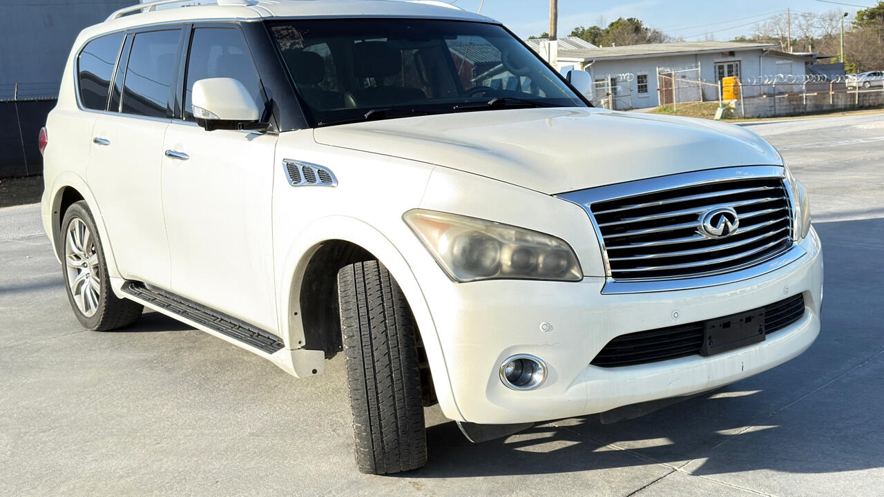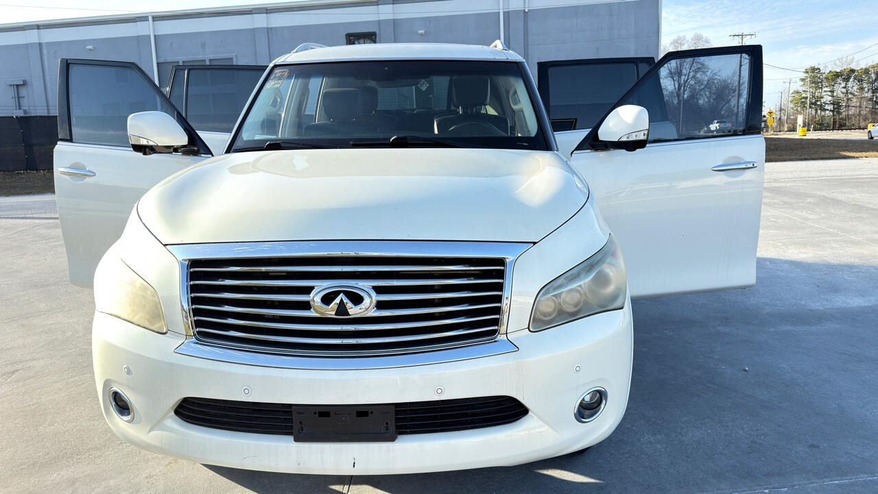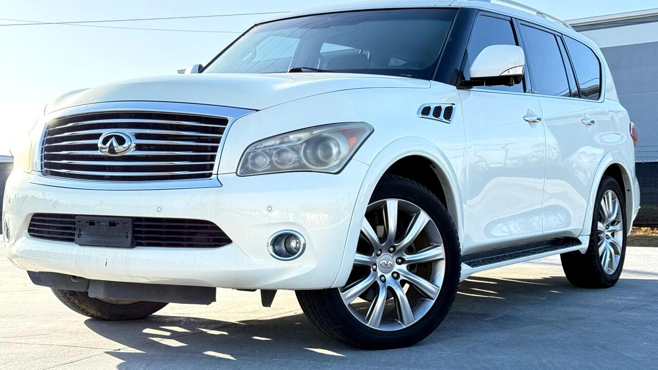Buckle up and get ready to elevate your driving experience with this sleek and stylish 2013 Infiniti QX56! This sophisticated white beauty is not just a car; it's a statement. Whether you're cruising through city streets or tackling rugged terrain, this Infiniti is up for any adventure with its exceptional 4WD/AWD capabilities.Equipped with top-of-the-line safety features like Child Safety Door Locks, ABS Brakes, Vehicle Stability Control System, and multiple airbags, you can have peace of mind knowing that you and your loved ones are well protected on the road. And with Electronic Brake Assistance and Traction Control, you'll have the confidence to navigate any driving situation with ease.When it comes to comfort and convenience, this Infiniti does not disappoint. Slip into the luxurious leather seats with Front Heated Seats, Front Power Lumbar Support, and Front Power Memory Seats, and let the worries of the day melt away. The genuine wood trim and heated steering wheel add a touch of elegance to the already upscale interior.Stay entertained and informed with the AM/FM Radio, CD Player, DVD Player, and Navigation Aid - perfect for those road trips or daily commutes. The Subwoofer provides crystal-clear audio quality, while the Steering Wheel Mounted Controls keep everything within easy reach.Whether you're heading out for a weekend getaway or just running errands around town, the spacious cargo area with Cargo Area Tiedowns and the Third Row Removable Seat offer versatility for all your storage needs. And with the Power Sunroof, you can let the sunshine in and enjoy the open air whenever the mood strikes.Not to mention, this Infiniti comes with a Carfax report, so you can buy with confidence, knowing the vehicle's history is transparent and reliable. With its stunning Alloy Wheels, Automatic Headlights, and Rear Spoiler, this Infiniti QX56 is sure to turn heads wherever you go.Don't miss your chance to own this incredible 2013 Infiniti QX56 - a perfect blend of luxury, performance, and safety. Come in today and experience the thrill of driving this exceptional vehicle for yourself!