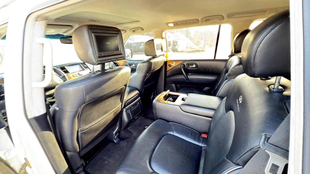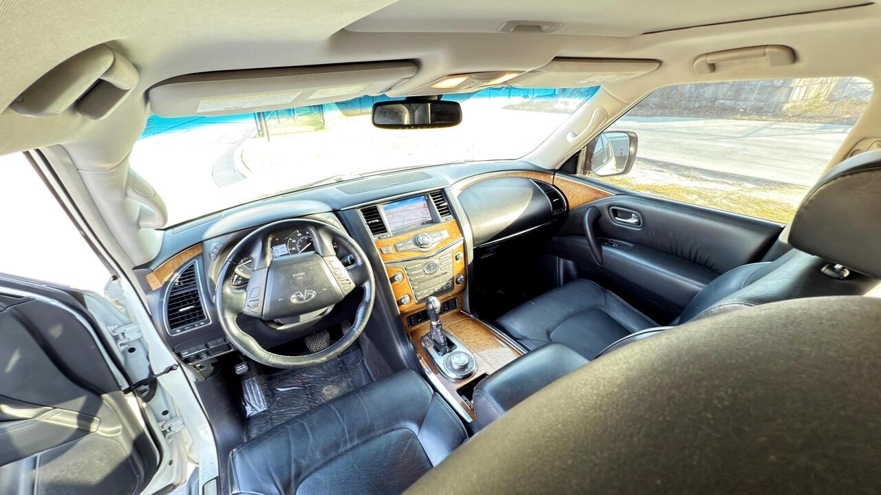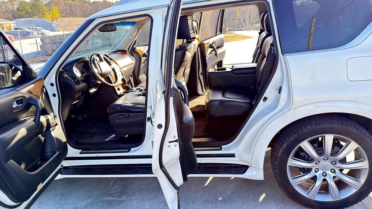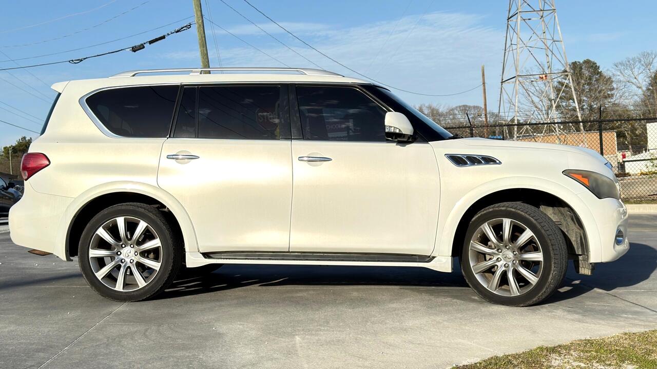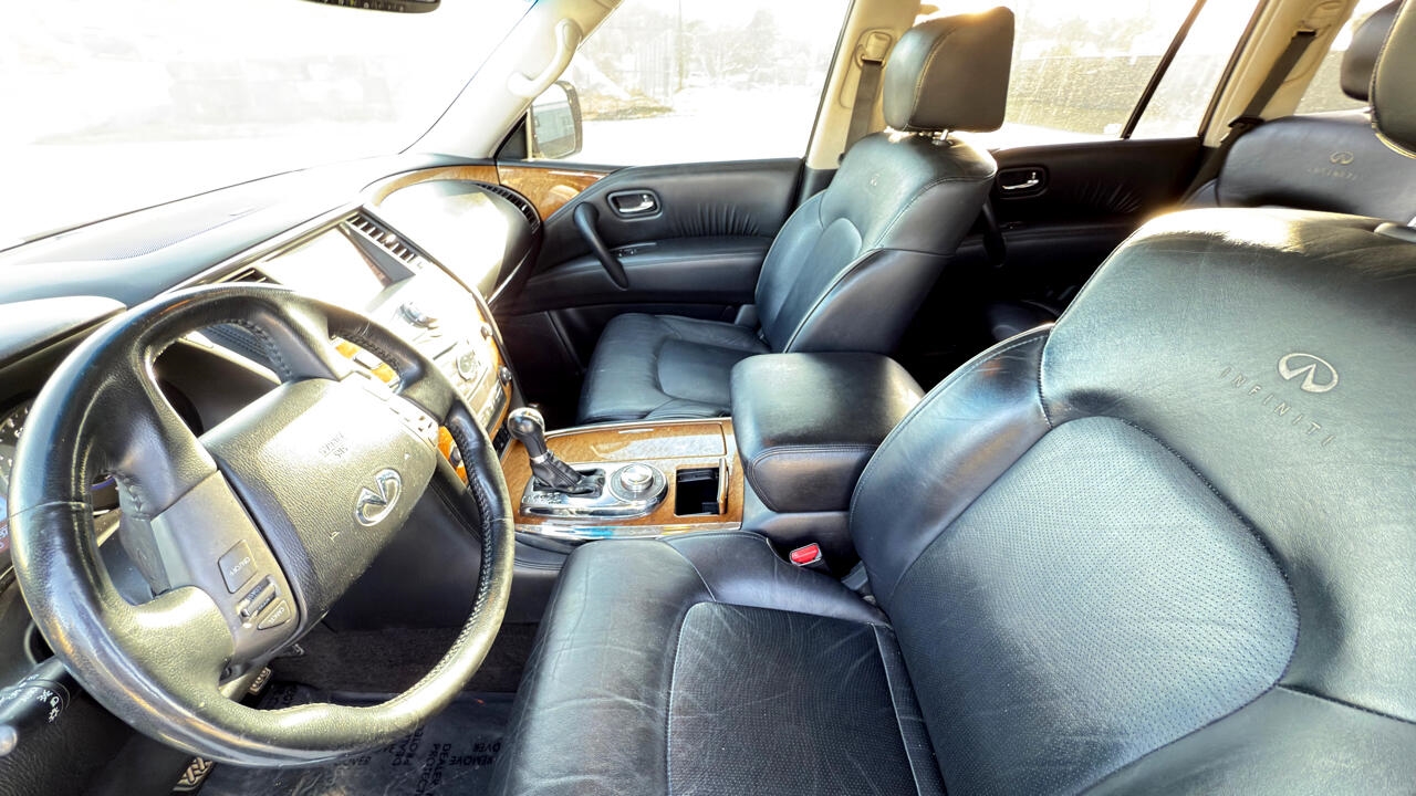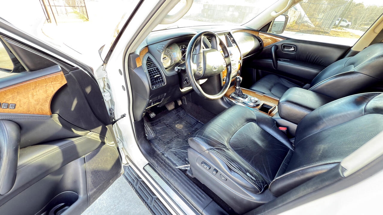 Buckle up and get ready to elevate your driving experience with this sleek and stylish 2013 Infiniti QX56! This sophisticated white beauty is not just a car; it's a statement. Whether you're cruising through city streets or tackling rugged terrain, this Infiniti is up for any adventure with its exceptional 4WD/AWD capabilities.Equipped with top-of-the-line safety features like Child Safety Door Locks, ABS Brakes, Vehicle Stability Control System, and multiple airbags, you can have peace of mind knowing that you and your loved ones are well protected on the road. And with Electronic Brake Assistance and Traction Control, you'll have the confidence to navigate any driving situation with ease.When it comes to comfort and convenience, this Infiniti does not disappoint. Slip into the luxurious leather seats with Front Heated Seats, Front Power Lumbar Support, and Front Power Memory Seats, and let the worries of the day melt away. The genuine wood trim and heated steering wheel add a touch of elegance to the already upscale interior.Stay entertained and informed with the AM/FM Radio, CD Player, DVD Player, and Navigation Aid - perfect for those road trips or daily commutes. The Subwoofer provides crystal-clear audio quality, while the Steering Wheel Mounted Controls keep everything within easy reach.Whether you're heading out for a weekend getaway or just running errands around town, the spacious cargo area with Cargo Area Tiedowns and the Third Row Removable Seat offer versatility for all your storage needs. And with the Power Sunroof, you can let the sunshine in and enjoy the open air whenever the mood strikes.Not to mention, this Infiniti comes with a Carfax report, so you can buy with confidence, knowing the vehicle's history is transparent and reliable. With its stunning Alloy Wheels, Automatic Headlights, and Rear Spoiler, this Infiniti QX56 is sure to turn heads wherever you go.Don't miss your chance to own this incredible 2013 Infiniti QX56 - a perfect blend of luxury, performance, and safety. Come in today and experience the thrill of driving this exceptional vehicle for yourself!