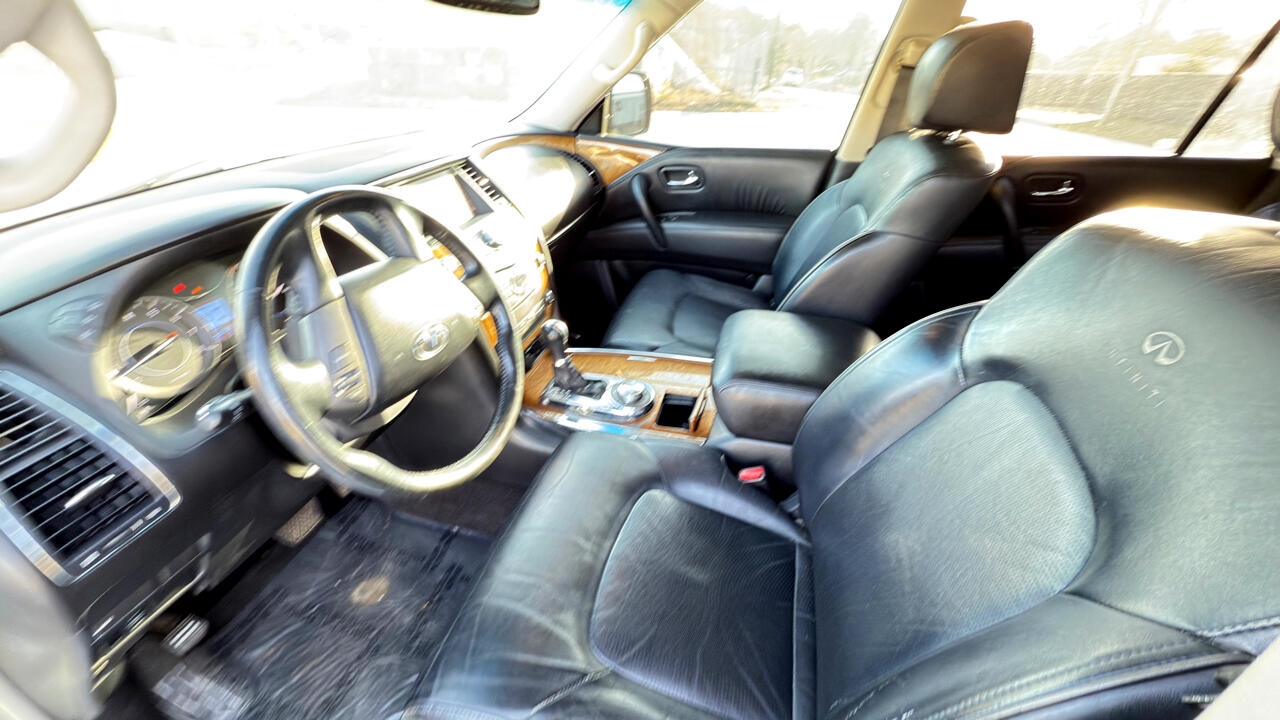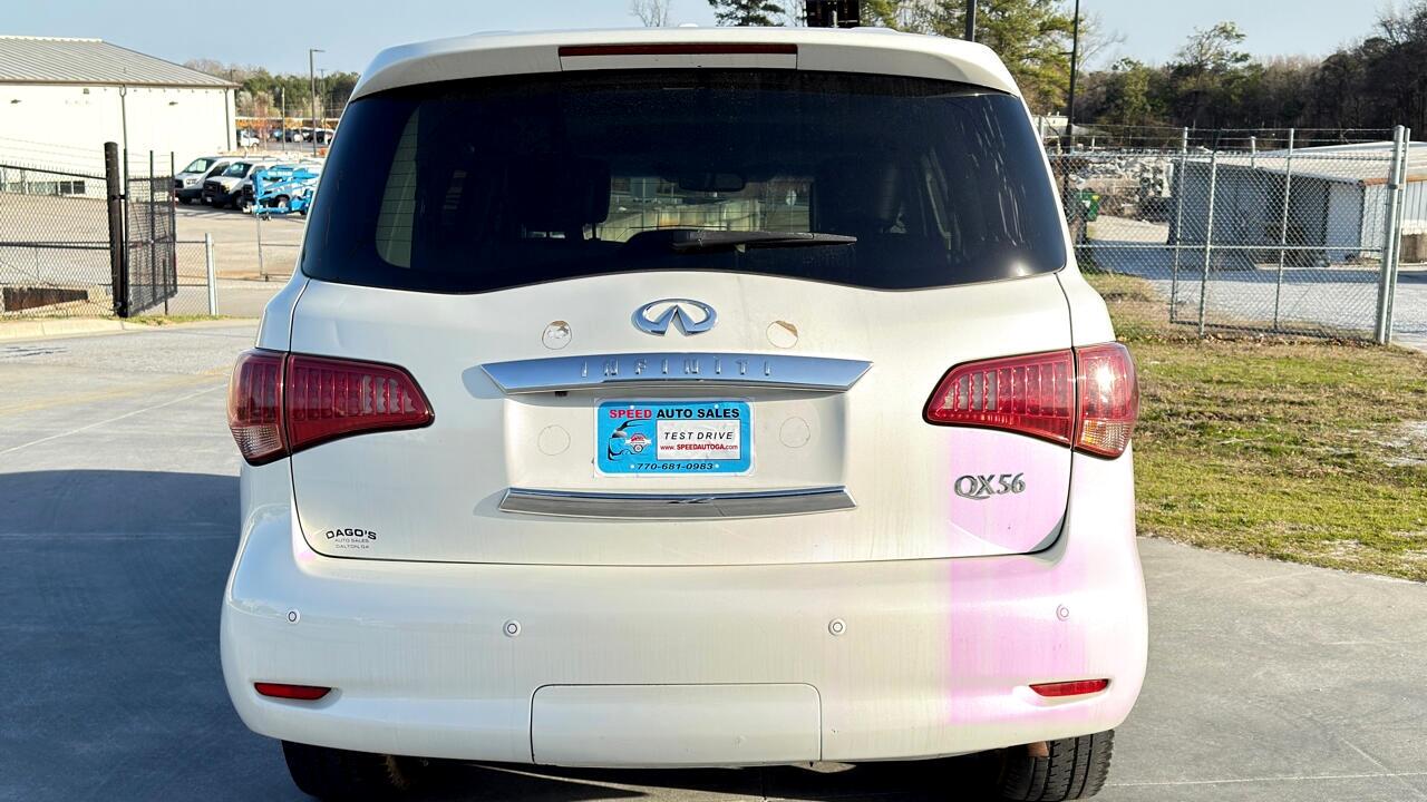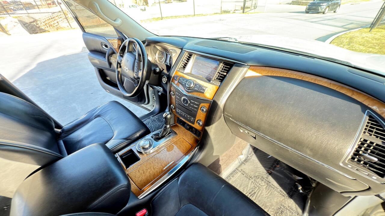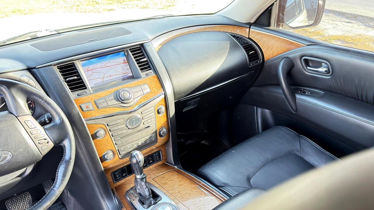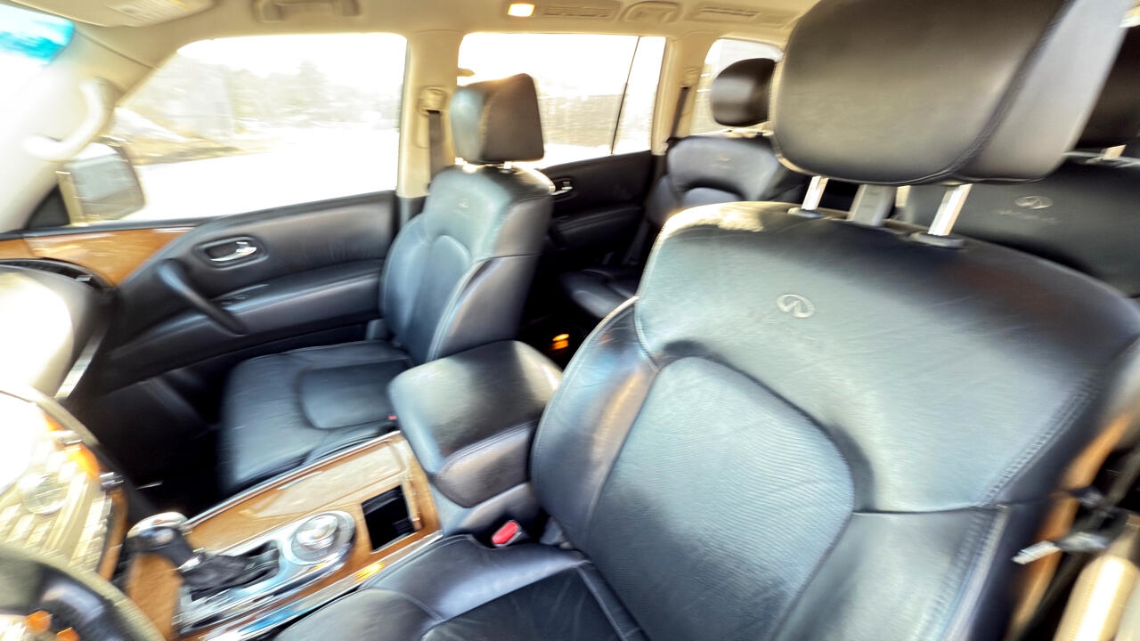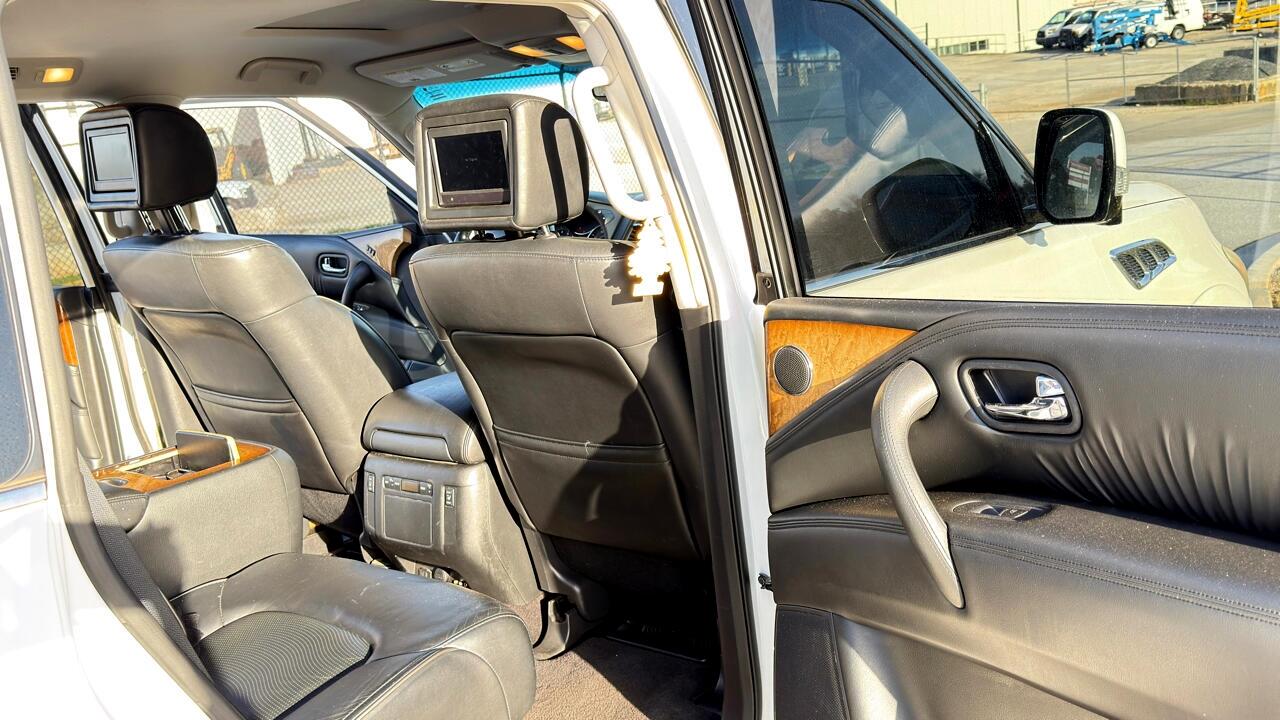 Buckle up and get ready to elevate your driving experience with this sleek and stylish 2013 Infiniti QX56! This sophisticated white beauty is not just a car; it's a statement. Whether you're cruising through city streets or tackling rugged terrain, this Infiniti is up for any adventure with its exceptional 4WD/AWD capabilities.Equipped with top-of-the-line safety features like Child Safety Door Locks, ABS Brakes, Vehicle Stability Control System, and multiple airbags, you can have peace of mind knowing that you and your loved ones are well protected on the road. And with Electronic Brake Assistance and Traction Control, you'll have the confidence to navigate any driving situation with ease.When it comes to comfort and convenience, this Infiniti does not disappoint. Slip into the luxurious leather seats with Front Heated Seats, Front Power Lumbar Support, and Front Power Memory Seats, and let the worries of the day melt away. The genuine wood trim and heated steering wheel add a touch of elegance to the already upscale interior.Stay entertained and informed with the AM/FM Radio, CD Player, DVD Player, and Navigation Aid - perfect for those road trips or daily commutes. The Subwoofer provides crystal-clear audio quality, while the Steering Wheel Mounted Controls keep everything within easy reach.Whether you're heading out for a weekend getaway or just running errands around town, the spacious cargo area with Cargo Area Tiedowns and the Third Row Removable Seat offer versatility for all your storage needs. And with the Power Sunroof, you can let the sunshine in and enjoy the open air whenever the mood strikes.Not to mention, this Infiniti comes with a Carfax report, so you can buy with confidence, knowing the vehicle's history is transparent and reliable. With its stunning Alloy Wheels, Automatic Headlights, and Rear Spoiler, this Infiniti QX56 is sure to turn heads wherever you go.Don't miss your chance to own this incredible 2013 Infiniti QX56 - a perfect blend of luxury, performance, and safety. Come in today and experience the thrill of driving this exceptional vehicle for yourself!