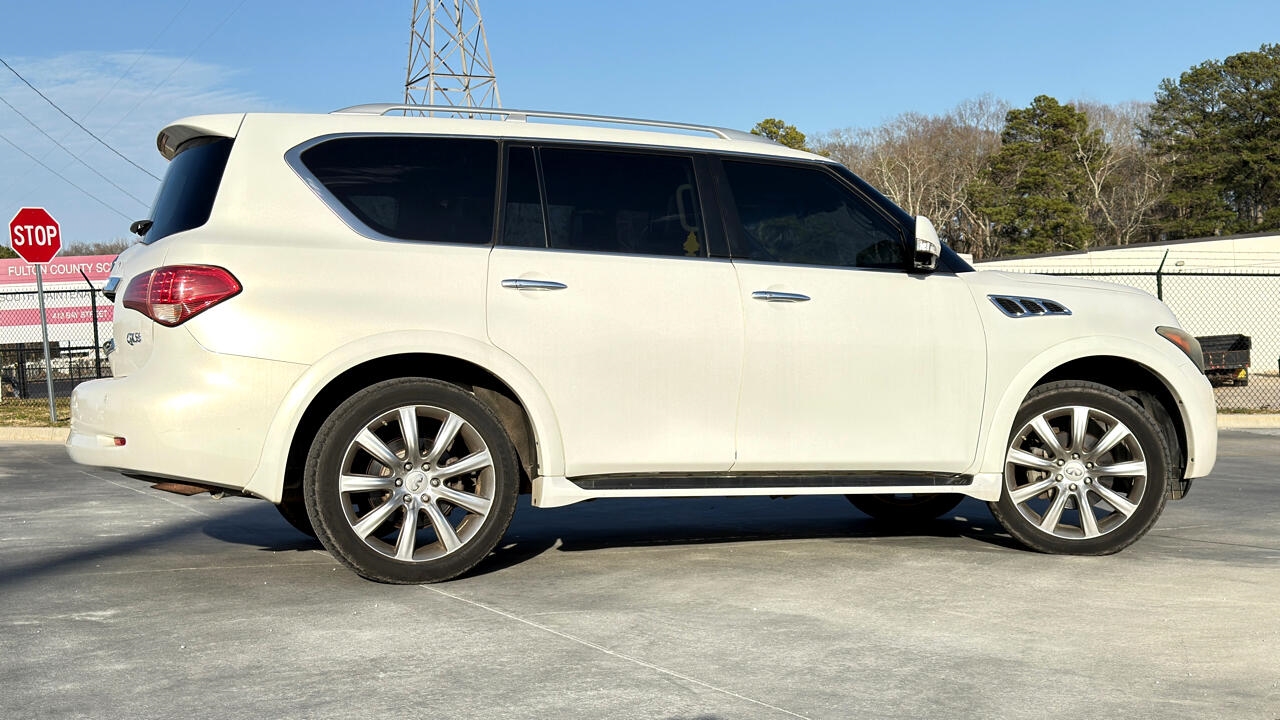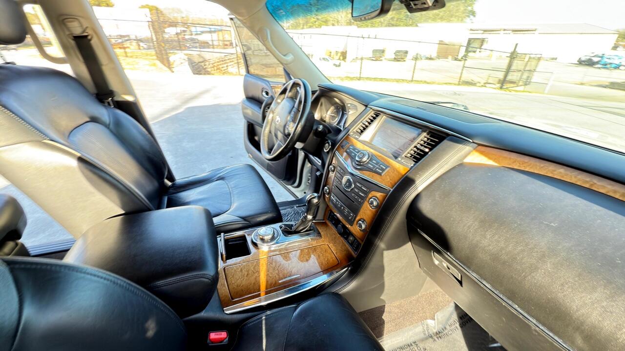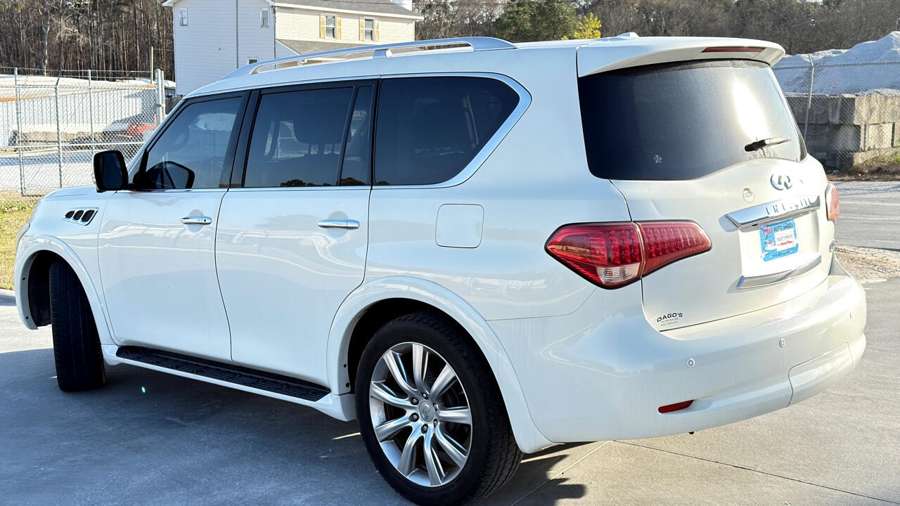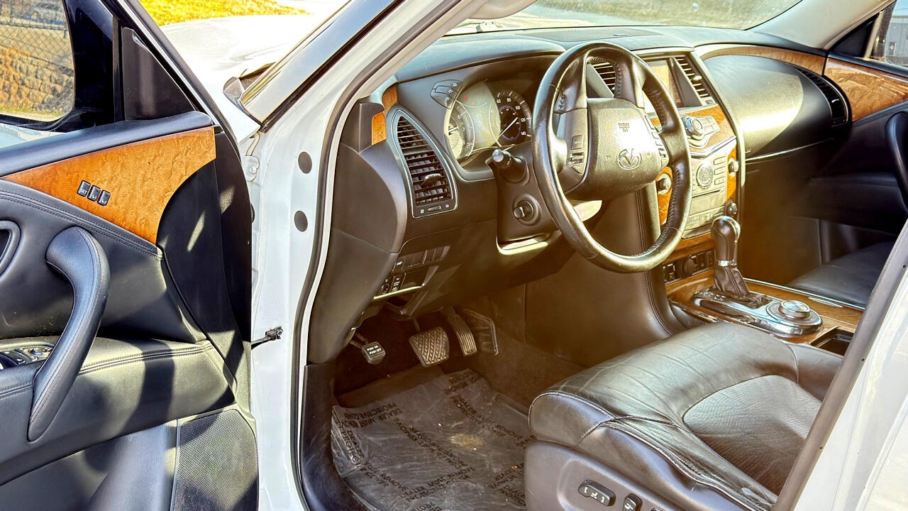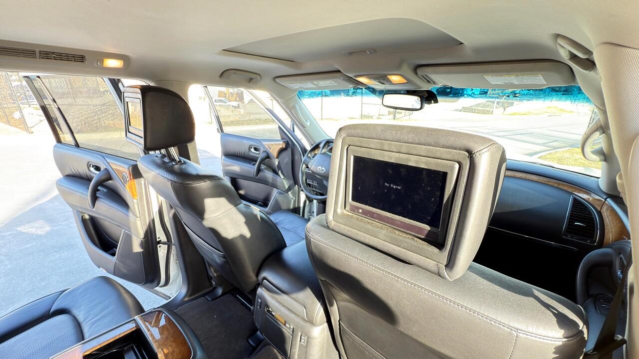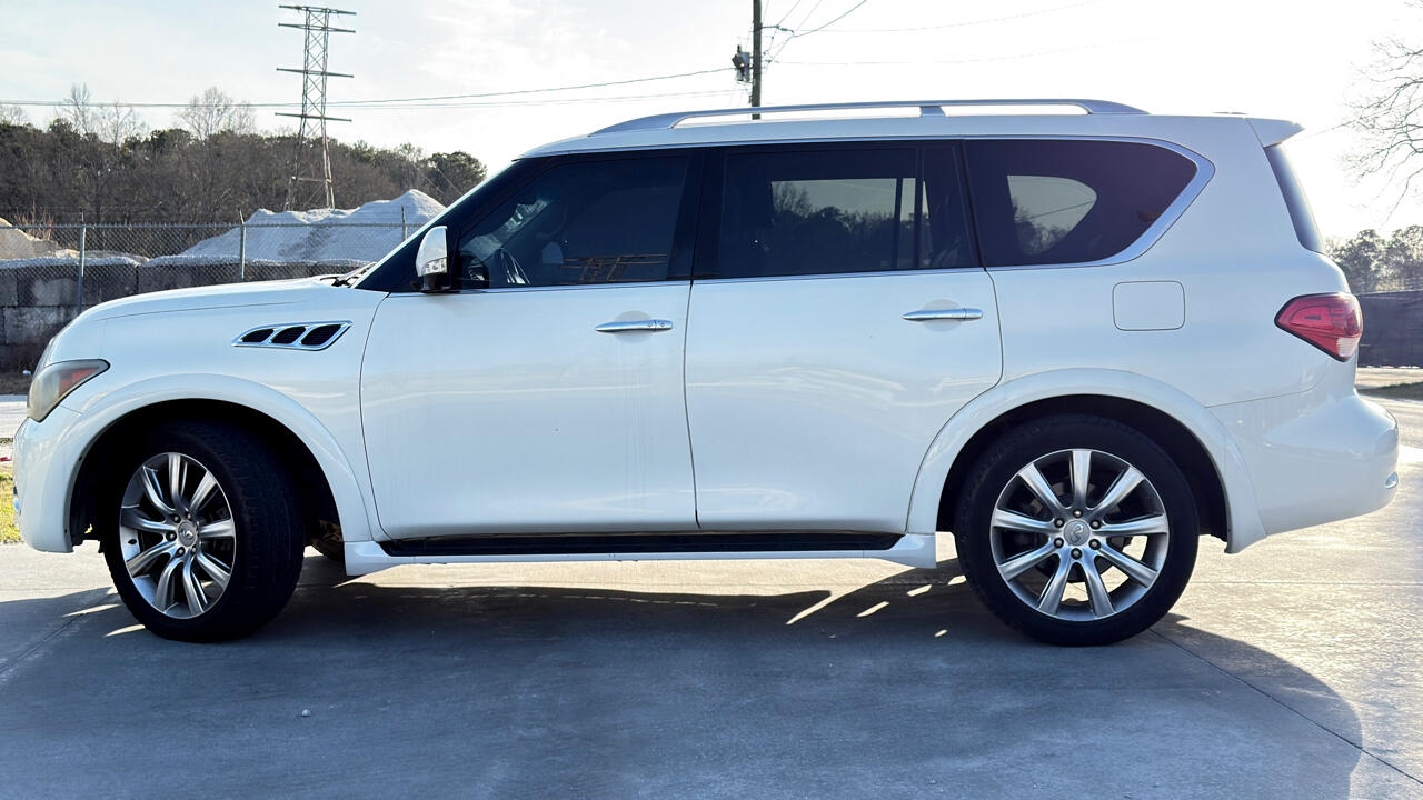 Buckle up and get ready to elevate your driving experience with this sleek and stylish 2013 Infiniti QX56! This sophisticated white beauty is not just a car; it's a statement. Whether you're cruising through city streets or tackling rugged terrain, this Infiniti is up for any adventure with its exceptional 4WD/AWD capabilities.Equipped with top-of-the-line safety features like Child Safety Door Locks, ABS Brakes, Vehicle Stability Control System, and multiple airbags, you can have peace of mind knowing that you and your loved ones are well protected on the road. And with Electronic Brake Assistance and Traction Control, you'll have the confidence to navigate any driving situation with ease.When it comes to comfort and convenience, this Infiniti does not disappoint. Slip into the luxurious leather seats with Front Heated Seats, Front Power Lumbar Support, and Front Power Memory Seats, and let the worries of the day melt away. The genuine wood trim and heated steering wheel add a touch of elegance to the already upscale interior.Stay entertained and informed with the AM/FM Radio, CD Player, DVD Player, and Navigation Aid - perfect for those road trips or daily commutes. The Subwoofer provides crystal-clear audio quality, while the Steering Wheel Mounted Controls keep everything within easy reach.Whether you're heading out for a weekend getaway or just running errands around town, the spacious cargo area with Cargo Area Tiedowns and the Third Row Removable Seat offer versatility for all your storage needs. And with the Power Sunroof, you can let the sunshine in and enjoy the open air whenever the mood strikes.Not to mention, this Infiniti comes with a Carfax report, so you can buy with confidence, knowing the vehicle's history is transparent and reliable. With its stunning Alloy Wheels, Automatic Headlights, and Rear Spoiler, this Infiniti QX56 is sure to turn heads wherever you go.Don't miss your chance to own this incredible 2013 Infiniti QX56 - a perfect blend of luxury, performance, and safety. Come in today and experience the thrill of driving this exceptional vehicle for yourself!
